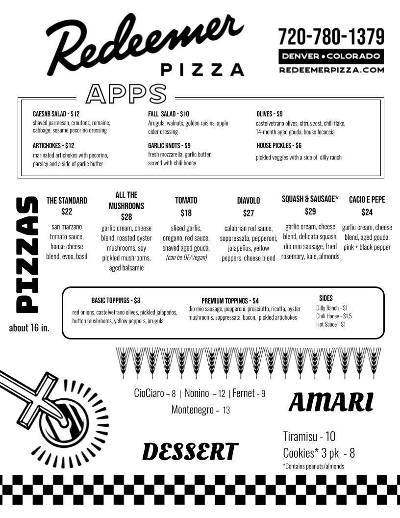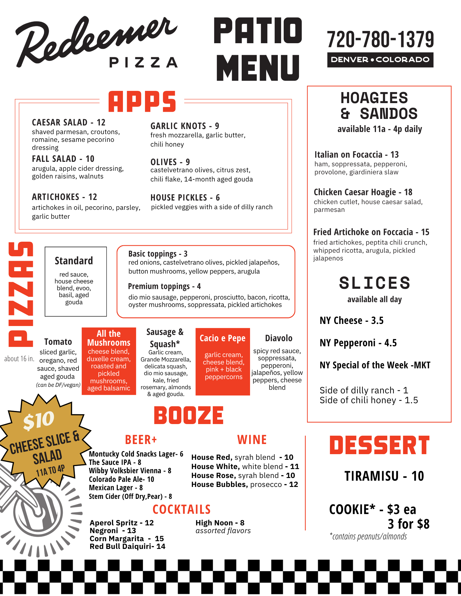 OUR MENU ORDER ONLINE SPECIALS MENUS Visit our instagram page for weekly pizza and sandwich specials! (SCROLL DOWN FOR LUNCH/PATIO MENU) LUNCH MENU(AVAILABLE AS COUNTER-SERVICE ON OUR BACK PATIO FROM 11A TO 4P) HOSTING A PARTY OR TRYING TO FEED A CROWD? LEAVE THE COOKING TO US! START THE CATERING CONVO